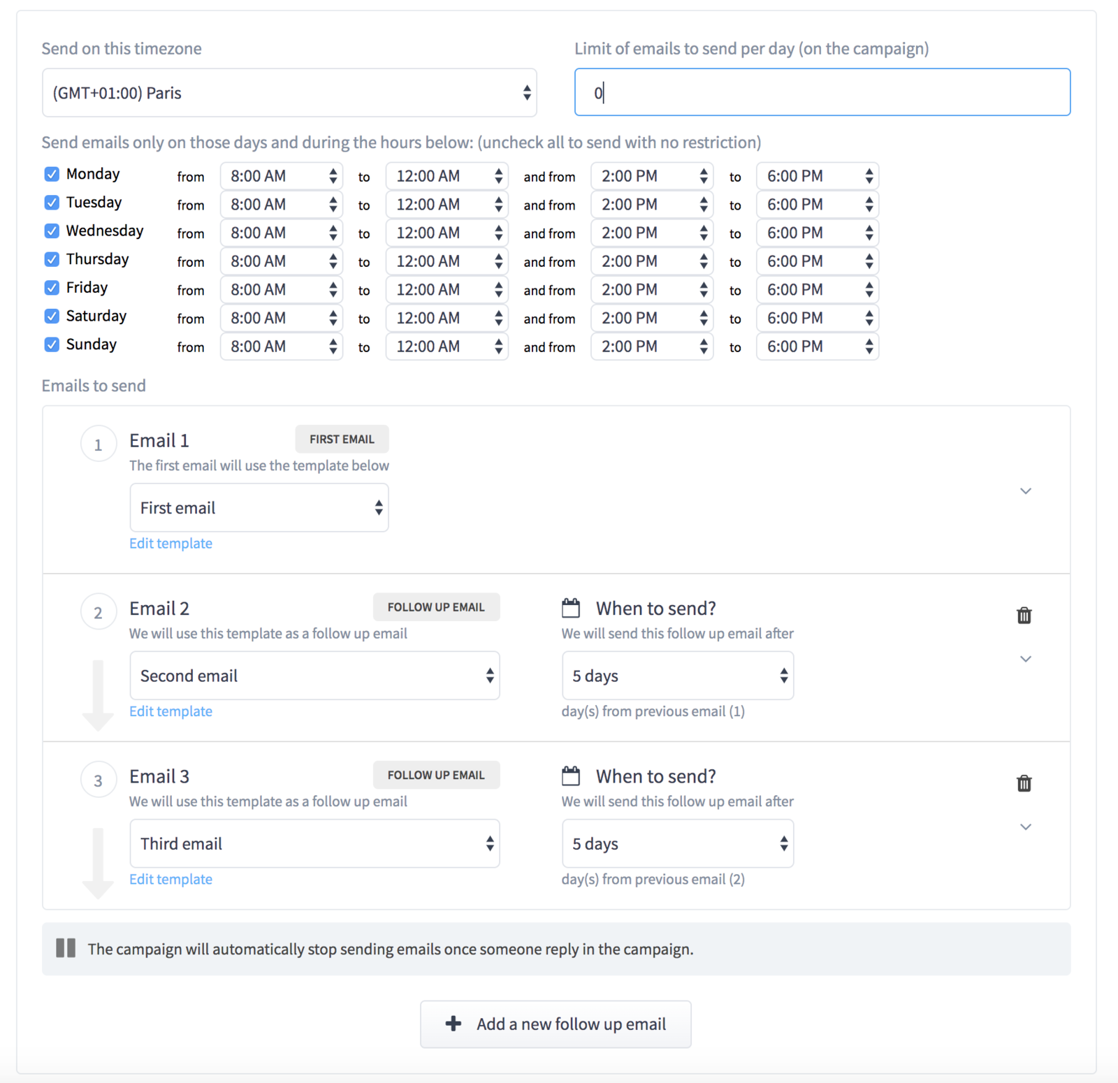 Edit your campaign actions including the order, follow-up sequence or stop an under-performing campaign and create a new campaign from the existing campaign to follow-up with separate sequence and much more.